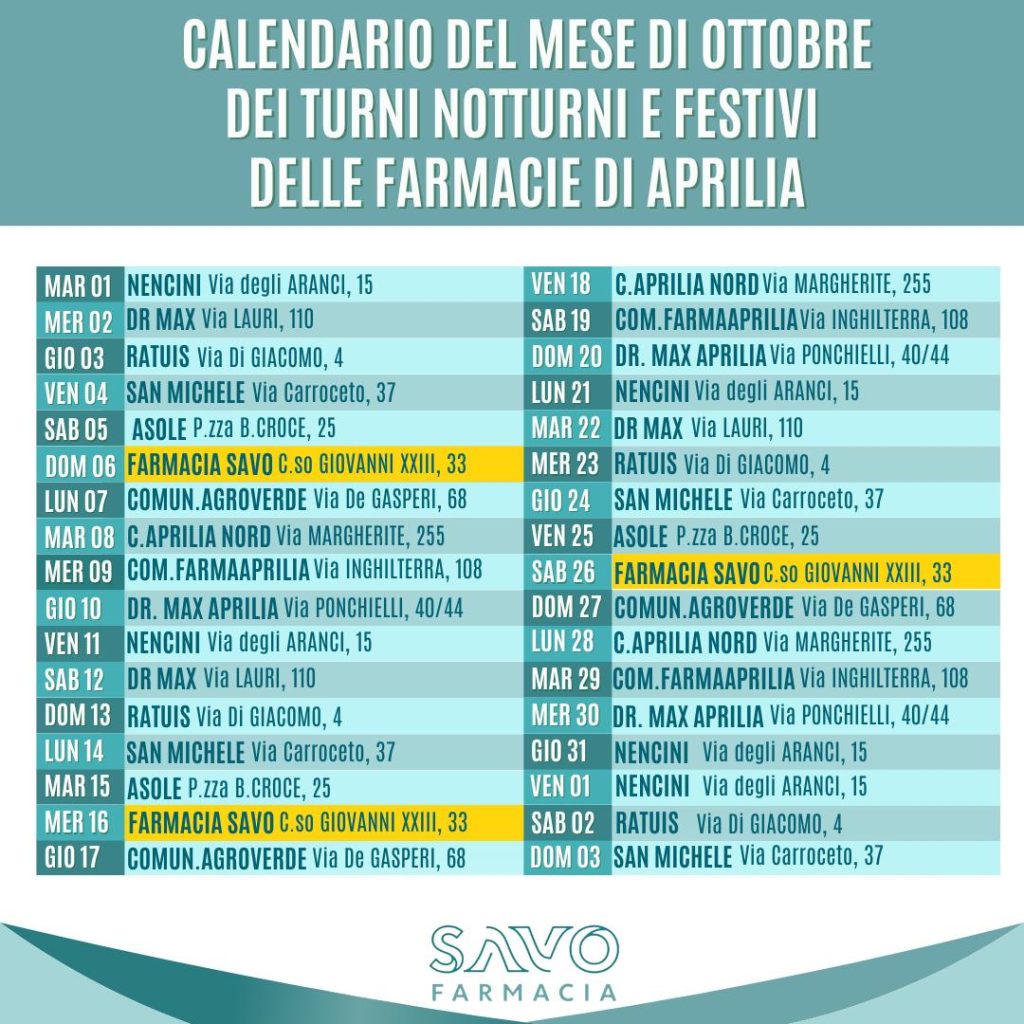Farmacie di turno ad Aprilia: questa domenica aperta la farmacia Savo di Corso Giovanni XXIII. Ecco il calendario di Ottobre.