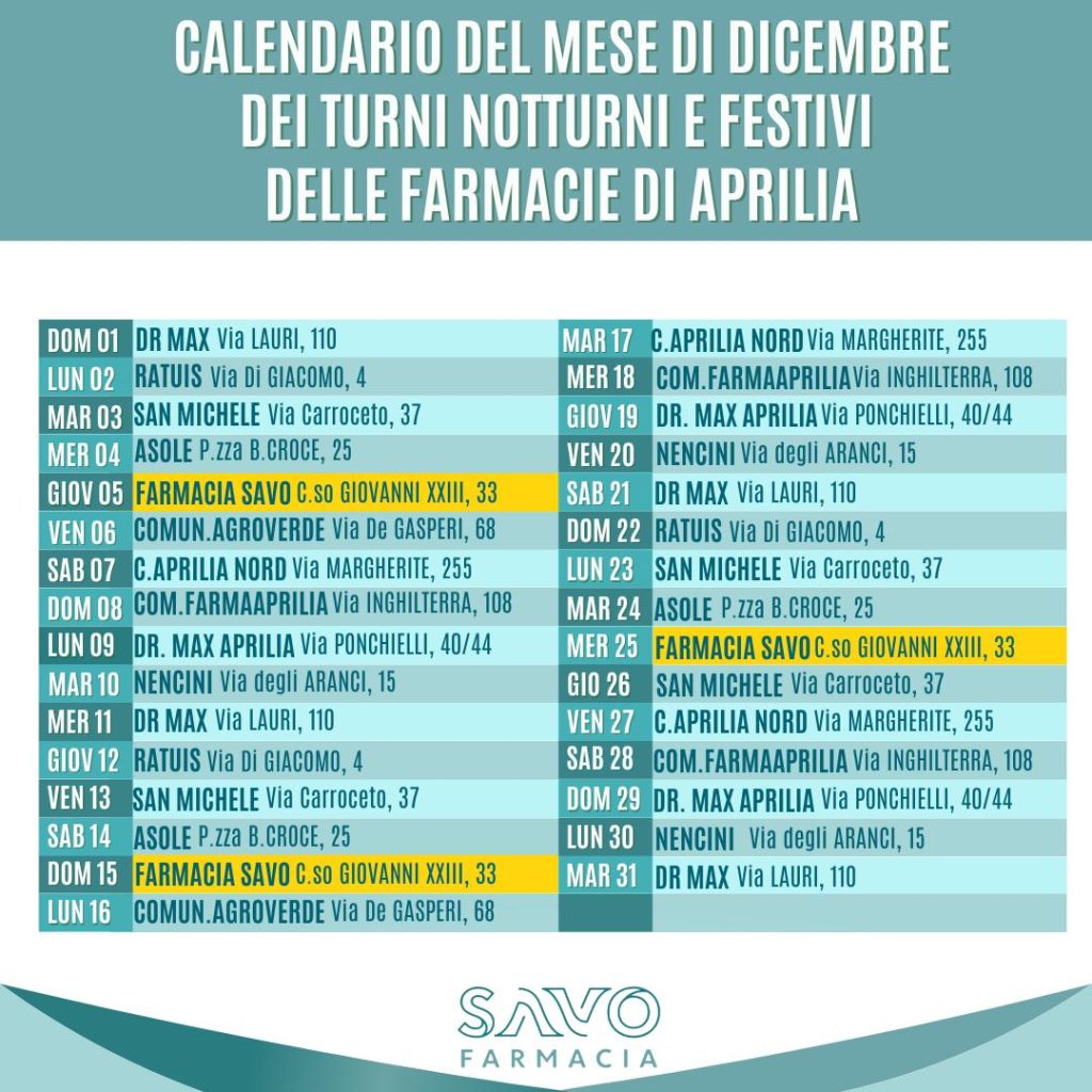 Farmacie di turno ad Aprilia: questa domenica aperta h24 la Farmacia Savo di Corso Giovanni XXIII. L’attività della dottoressa Fiorella Savo sarà aperta dalle 8.30 di questa domenica 15 Dicembre e sino alle 8.30 di lunedì 16 Dicembre.