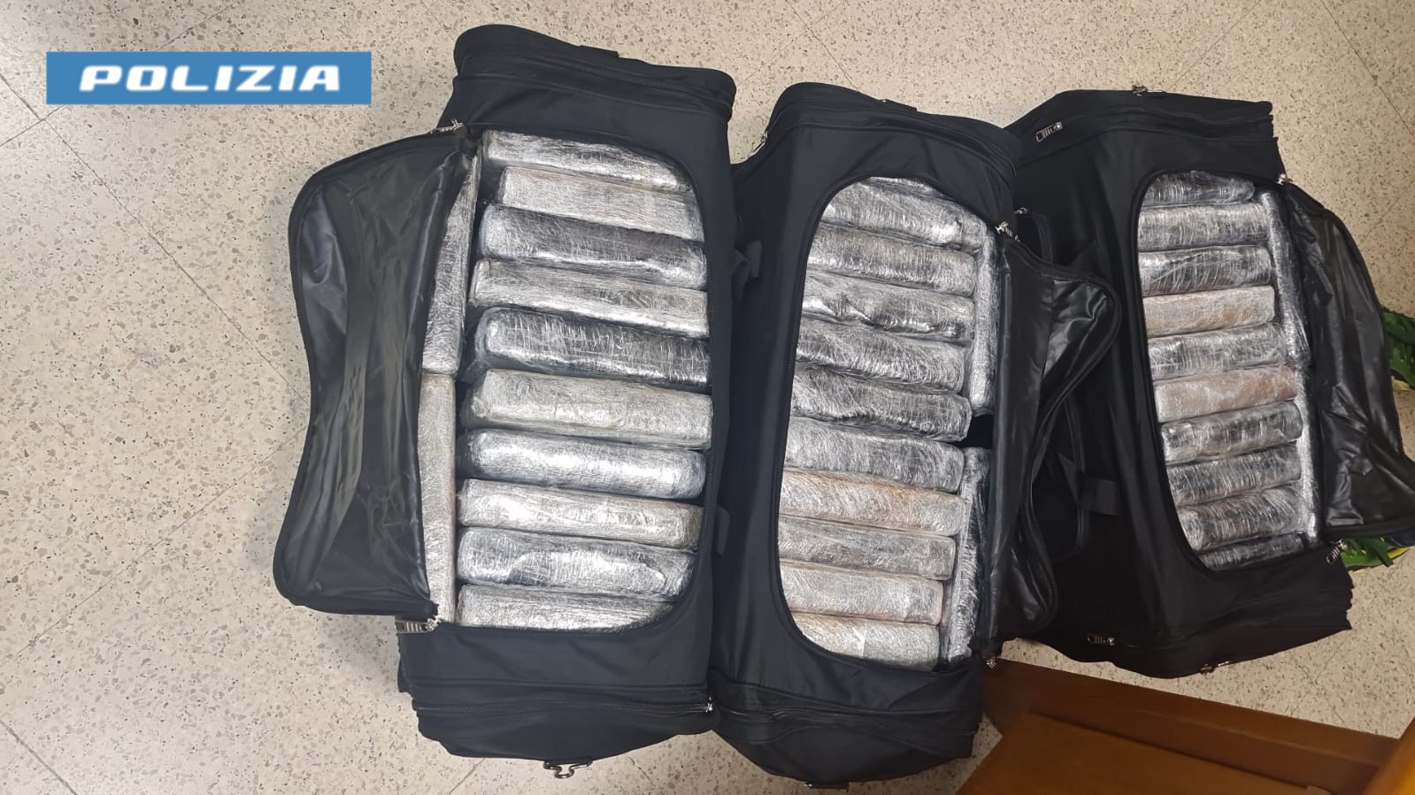 All’interno della vettura, nel vano bagagliaio, sono stati rinvenuti tre borsoni al cui interno erano presenti numerosi panetti incellofanati che, come confermato, allo stato, da successivi test effettuati da personale della Polizia Scientifica, contenevano 105 kg di cocaina.