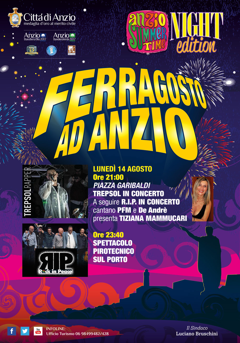 Dopo Trepsol sul palco saliranno i R.I.P. (Dashamir Haxha, Fabrizio Graziosi, Claudio Tulli, Giovanni Bruschini, Valter Cozzolino e Tony Arancio) che canteranno e suoneranno i brani di Fabrizio De Andrè, della Premiata Forneria Marconi ed altri gruppi rock progressive italiani. "Era il 1974 quando un gruppo di adolescenti, con la passione per la musica, si innamorò di un LP della Premiata Forneria Marconi (PFM) dal titolo <Prime Impressioni>. Quella sera del 74 nacquero i R.I.P." che, questo lunedì 14 agosto, torneranno sul palco della loro Anzio per una serata di musica live che terminerà, alle 23.40, con lo spettacolo pirotecnico sul Porto di Anzio che illuminerà il Ferragosto Anziate della stagione estiva, record di presenze, sul territorio neroniano.