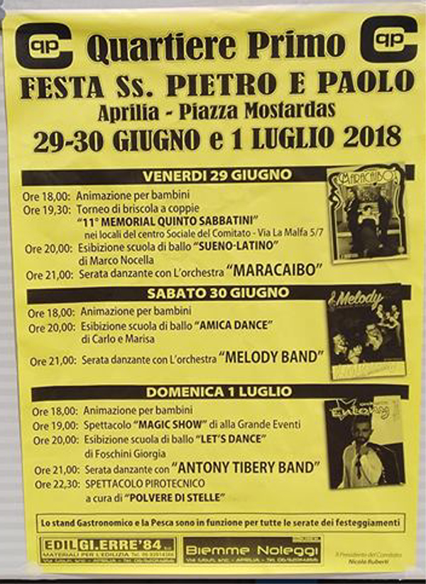 Sino a domani, domenica 1° luglio, presso il Quartiere Primo di Aprilia, si svolge la festa in onore dei Santi Pietro e Paolo. In Piazza Mostardas sarà un fine settimana di eventi, con tornei di briscola, esibizione di balli, giochi, musica dal vivo e gastronomia. Per tutta la durata della festa, sarà in funzione lo stand gastronomico e la pesca del Comitato di Quartiere.