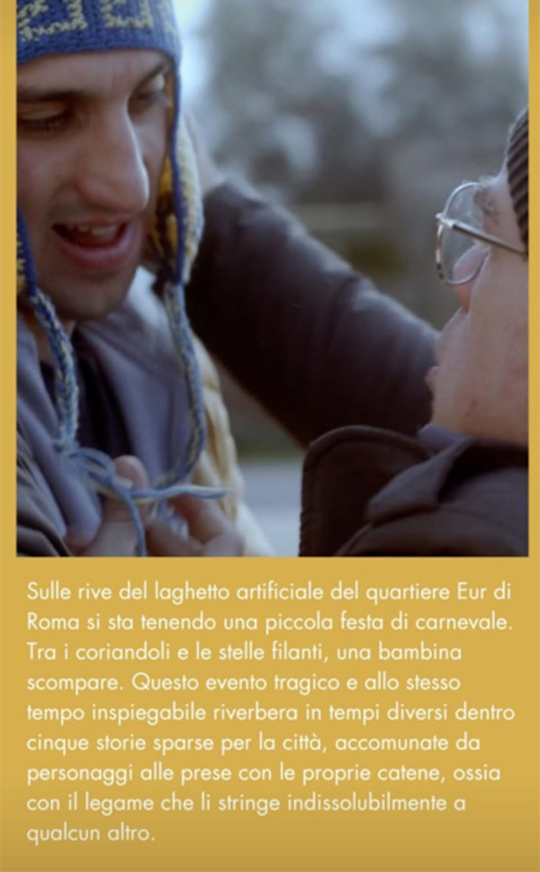Sulle rive del laghetto artificiale del quartiere Eur di Roma si sta tenendo una piccola festa di carnevale. Tra i coriandoli e le stelle filanti, una bambina scompare. Questo evento tragico e allo stesso tempo inspiegabile riverbera in tempi diversi dentro cinque storie sparse per la città, accomunate da personaggi alle prese con le proprie catene, ossia con il legame che li stringe indissolubilmente a qualcun altro.