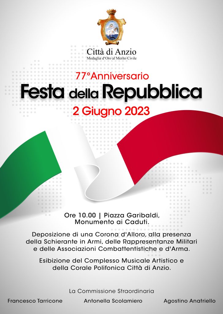 Si terrà venerdì 2 giugno, alle ore 10.00, ad Anzio al Monumento ai Caduti - Piazza Garibaldi, la celebrazione istituzionale per il 77° anniversario della proclamazione della Repubblica Italiana, programmata dalla Commissione Straordinaria della Città di Anzio.