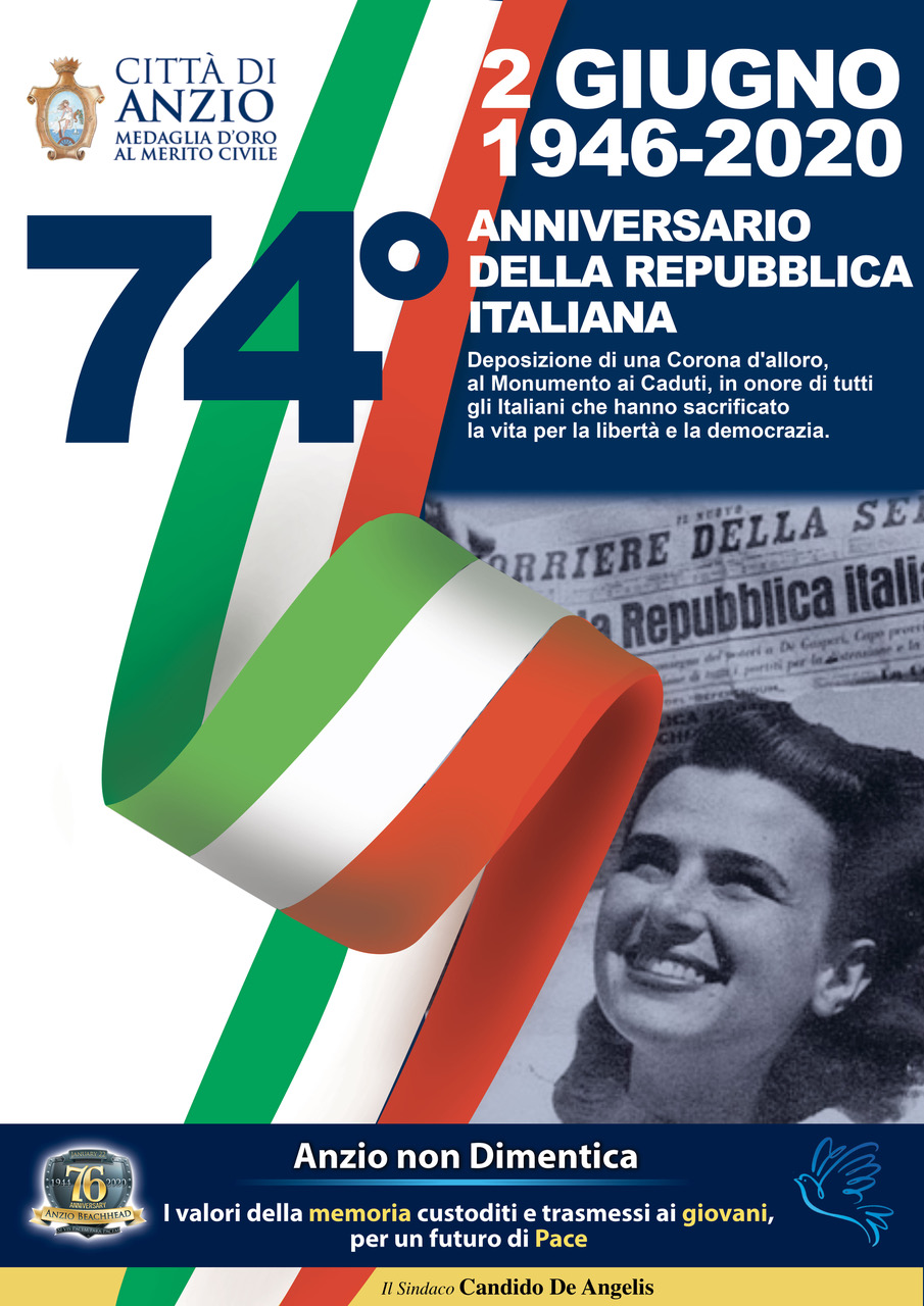 "Anzio non dimentica, i valori della memoria custoditi e trasmessi ai giovani, per un futuro di Pace": domani, martedì 2 giugno, per celebrare il 74° Anniversario della Repubblica Italiana, nella massima sicurezza a tutela della salute pubblica, il Sindaco di Anzio, Candido De Angelis, deporrà una Corona d'alloro, al Monumento ai Caduti, in onore di chi ha sacrificato la vita per la libertà e la democrazia.
