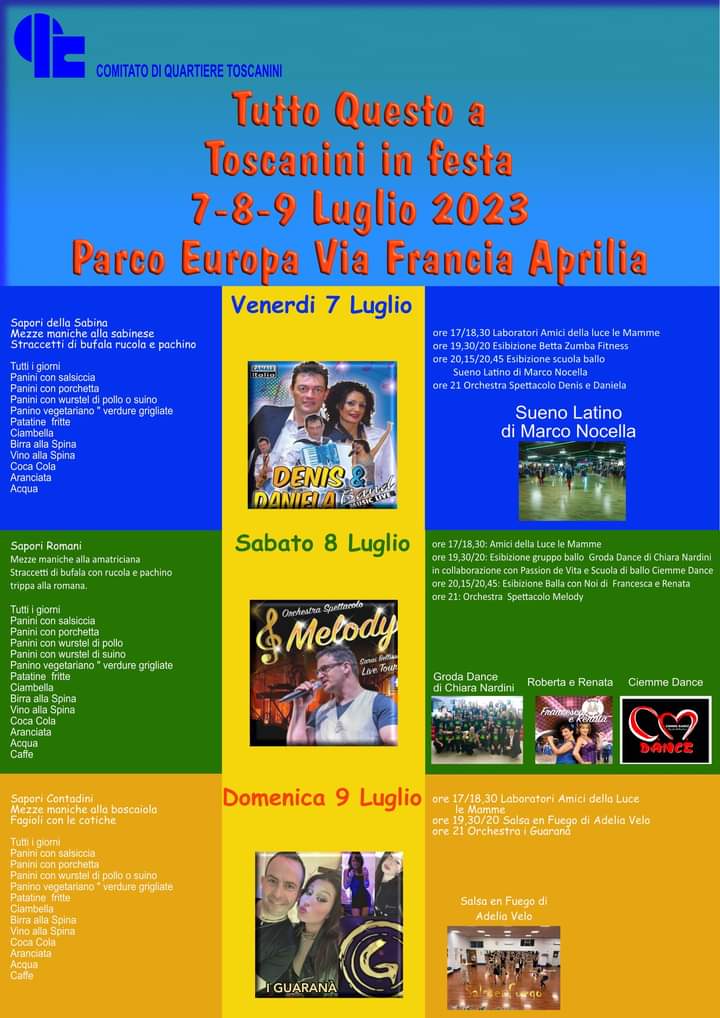 Festa questo fine settimana al quartiere Toscanini di Aprilia. Da venerdì 7 a domenica 9 Luglio l’appuntamento è al Parco Europa di via Francia. Di seguito il programma dei festeggiamenti: