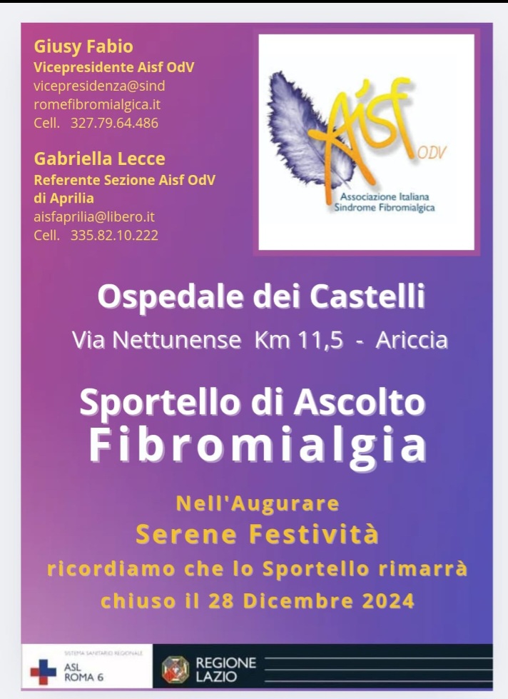 Fibromialgia, chiusi per alcuni giorni, in occasione delle festività natalizie, gli sportelli d’ascolto della sezione di Aprilia dell’Aisf, l’Associazione Italiana Sindrome Fibromialgica, alla Asl di Aprilia e al Noc, l’Ospedale dei Castelli, ad Ariccia. Lo sportello di ascolto di Aprilia tornerà ad essere attivo dal 7 Gennaio, mentre quello dell’Ospedale dei Castelli dal 4 Gennaio.