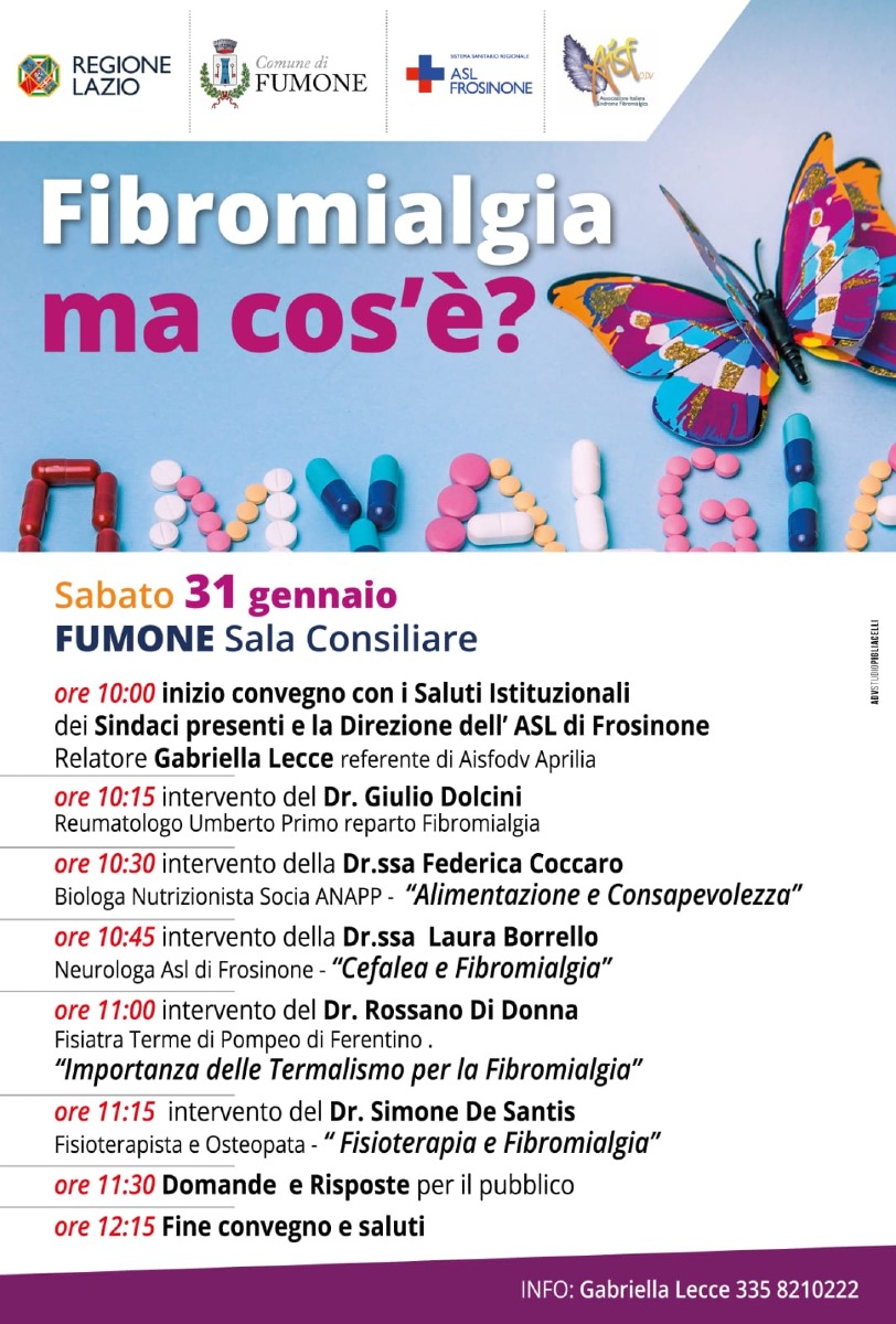 “Fibromialgia, ma cos’è?”. La sezione di Aprilia dell’Aisf, l’Associazione Italiana Sindrome Fibromialgica, sabato 31 gennaio, sarà presente ad un convegno a Fumone, in provincia di Frosinone, che si terrà a partire dalle 10.00 del mattino presso l’Aula Consiliare del Comune.