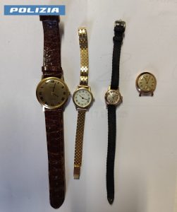 Nell’androne del palazzo incrociavano un uomo che frettolosamente tentava di uscire con una borsa nera a tracolla. Gli agenti immediatamente fermavano l’uomo e rinvenivano all’interno della borsa numerosi orologi e oggetti d’oro, “sequestrati” all’anziana signora nel corso della finta perquisizione.