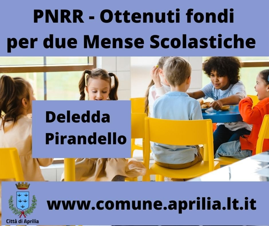 “Altri due progetti presentati dall’amministrazione comunale, unica tra i grandi comuni della provincia di Latina a rientrare nel finanziamento europeo, - si legge nella nota del Comune - saranno sostenuti dalle risorse del Piano Nazionale di Ripresa e Resilienza (PNRR). Il primo finanziamento ammonta a 560 mila euro e andrà a sostenere la realizzazione di una nuova mensa scolastica all’interno della scuola elementare Grazia Deledda di via Carducci. Con la seconda progettualità, di 290 mila euro, l’assessorato ai lavori Pubblici andrà a potenziare le classi mensa del plesso Pirandello di via Lazio”.