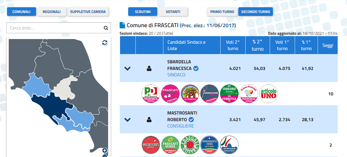 Si festeggia a Frascati per la nuova sindaca Francesca Sbardella del centrosinistra che ha ottenuto il 54% di voti. Battuto Roberto Mastrosanti che si è attestato al 46%. Ai festeggiamenti per la neo sindaca hanno partecipato anche il senatore e segretario regionale del PD Bruno Astorre, marito della neosindaca, e il sindaco di Albano Massimiliano Borelli.