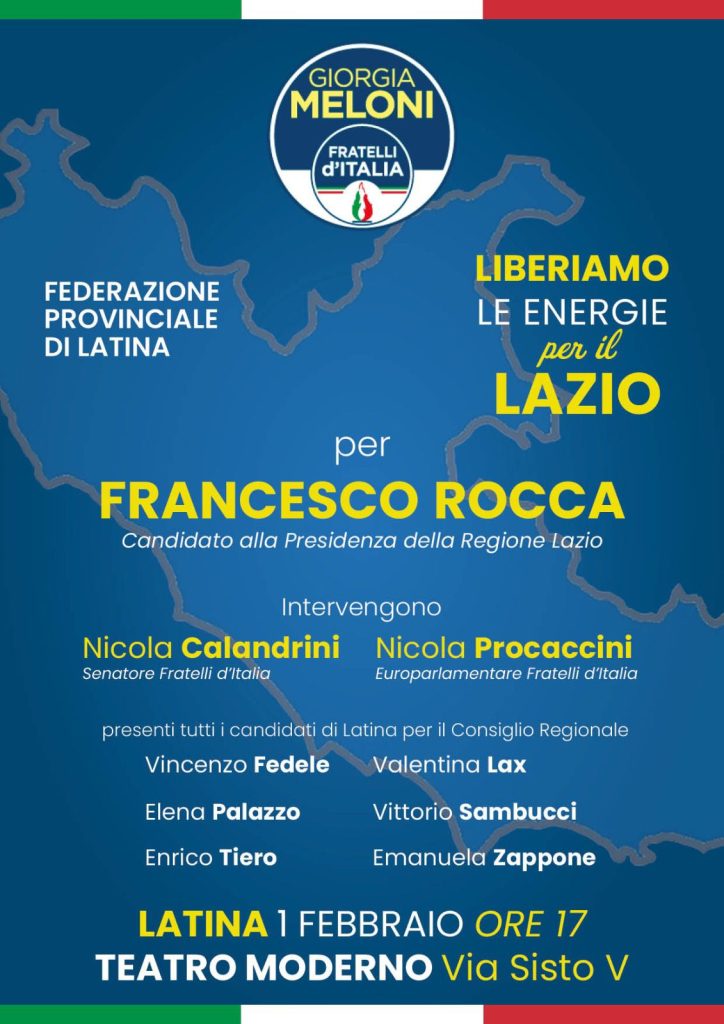 Fratelli d’Italia ospita a Latina il candidato alla presidenza della Regione, Francesco Rocca: l’appuntamento è per mercoledì 1 Febbraio, alle 17.00, al teatro Moderno. Rocca sarà affiancato dal coord...