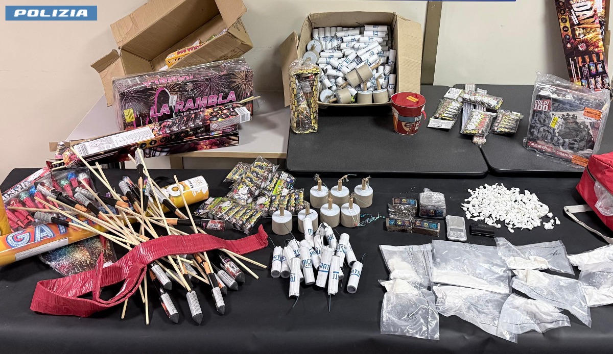 Sequestrati complessivamente circa 100 chilogrammi di materiale pirotecnico, detenuto in assenza delle prescritte autorizzazioni di polizia. Recuperata anche cocaina