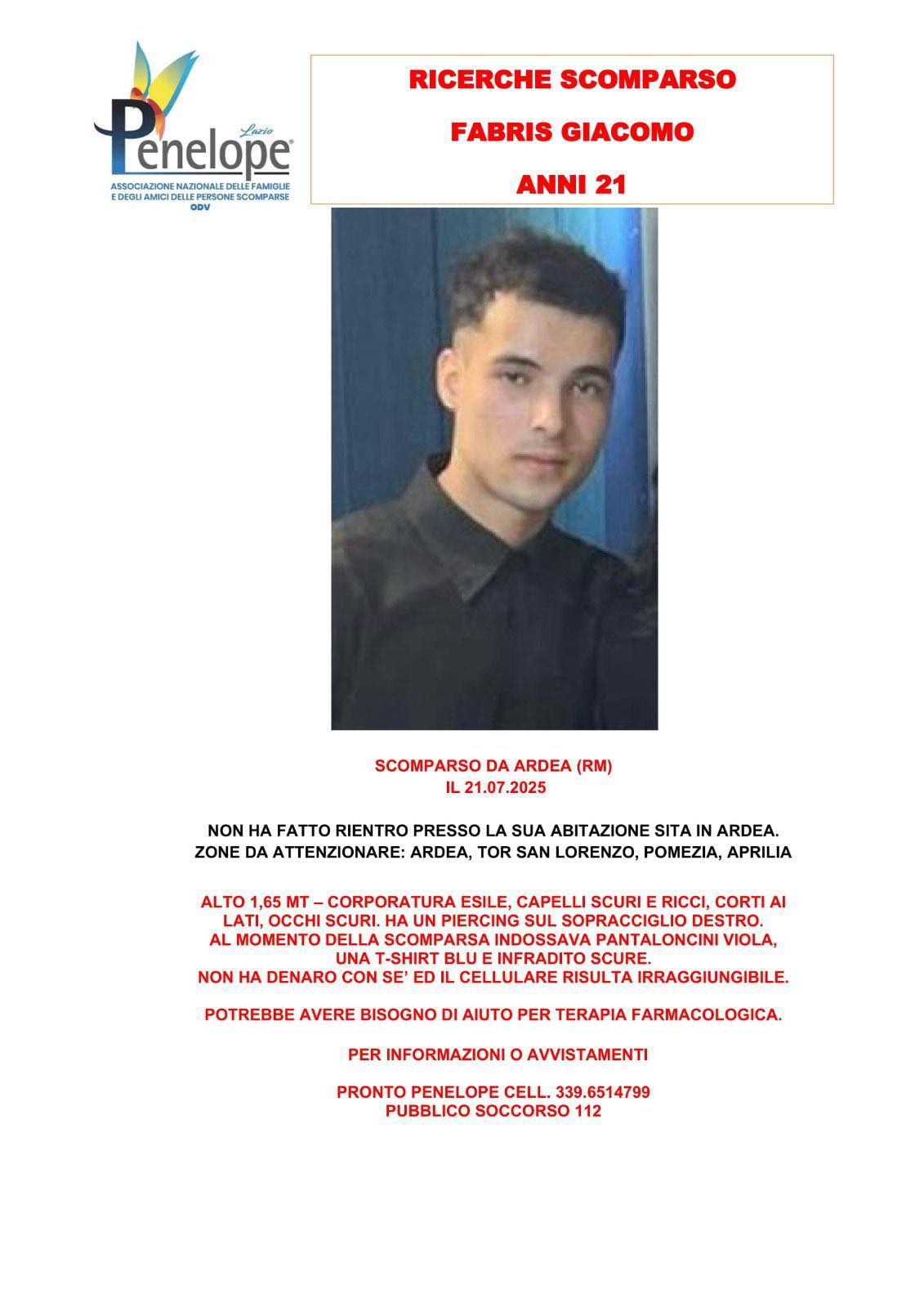 Si chiede la massima condivisione per riportare Giacomo a casa. Per info e segnalazioni si può contattare il numero di Pronto Penelope: 339/65.14.799.