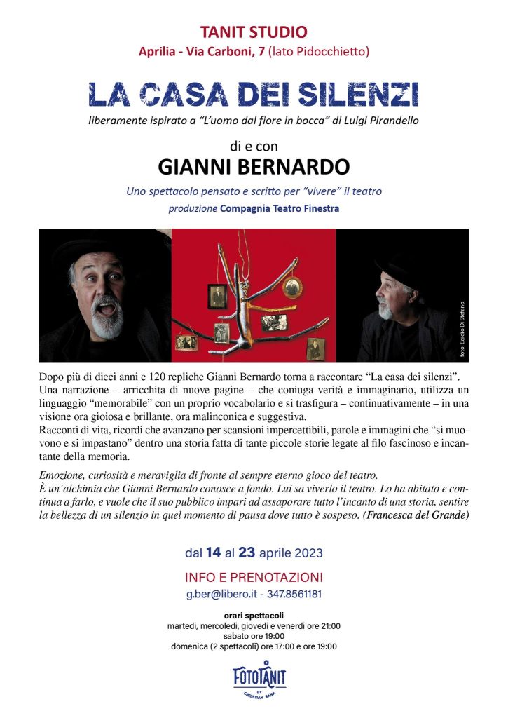 Sta per concludersi, con un grande successo di pubblico e con una serie di sold out, la messa in scena dello spettacolo “La Casa dei Silenzi” dell’attore Gianni Bernardo, sino a domenica 23 aprile sul palco del “Tanit Studio”, in via Carboni, ad Aprilia. Ci sono ancora pochi posti disponibili per la doppia replica programmata per domenica alle 17.00 e alle 19.00.