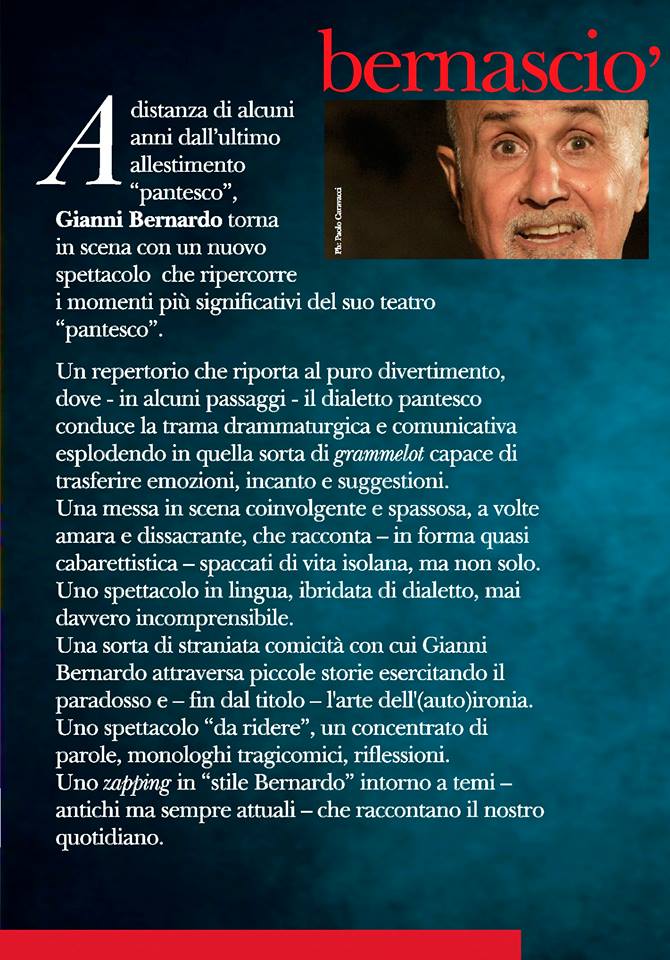 Ilnoto attore Gianni Bernardo torna sul palco con “Bernasciò”, all’ex Claudia. Unnuovo spettacolo che richiama e ripercorre alcuni dei momenti più significatividel “teatro pantesco”, confezionato in c...