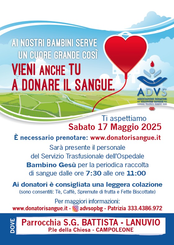 Giornata di raccolta sangue sabato 17 Maggio alla parrocchia “San Giovanni Battista” di Campoleone. Ad organizzarla l’associazione “Donatori Volontari Sangue” a favore dell’ospedale Pediatrico “Bambino Gesù” di Roma. L’appuntamento è dalle 7.30 alle 11.00 nel piazzale della chiesa. Ai donatori è consigliata una leggera colazione. E’ necessario prenotare attraverso il sito www.donatorisangue.it.