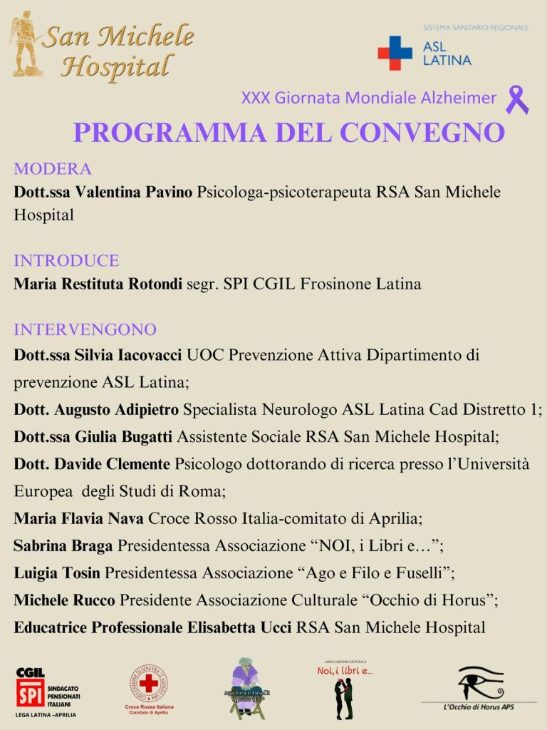 In occasione della 30° giornata mondiale dell'Alzheimer presso la RSA San Michele Hospital di Aprilia si terrà il convegno "Attraversando il tempo", in collaborazione con la ASL distretto di Latina e le associazioni del territorio che collaborano nelle attività di stimolazione cognitiva ed emotiva per i pazienti non autosufficienti con decadimento cognitivo, al fine di promuovere tutte quelle strategie che possono favorire un invecchiamento attivo anche degli ospiti delle strutture sanitarie.