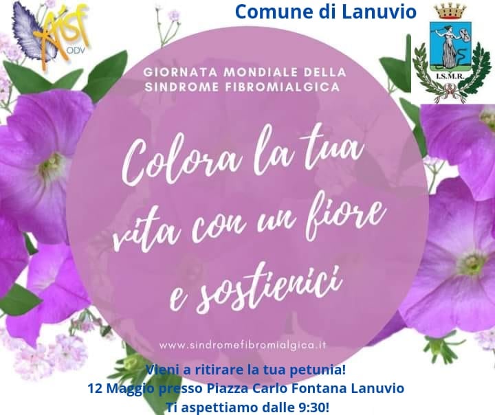 Giornata Mondiale della Fibromialgia: anche ad Aprilia, Lanuvio e Velletri torna l’iniziativa dell’associazione Aisf “Illuminiamo la Fibromialgia”. L’evento, che consisterà nell’illuminare di viola piazze, edifici e monumenti in tutta Italia, si pone l’obiettivo di sensibilizzare l’opinione pubblica sulle condizioni del paziente fibromialgico. Dei banchetti informativi saranno anche sul nostro territorio. Giovedì 12 Maggio dalle 9.00 alle 19.00 l’Aisf sarà ad Aprilia, in Piazza Roma, con un banchetto informativo. Acquistando una petunia viola, simbolo dell’evento, si contribuirà alla ricerca e alla terapia. La statua di San Michele Arcangelo, per l’occasione, sarà illuminata di viola.