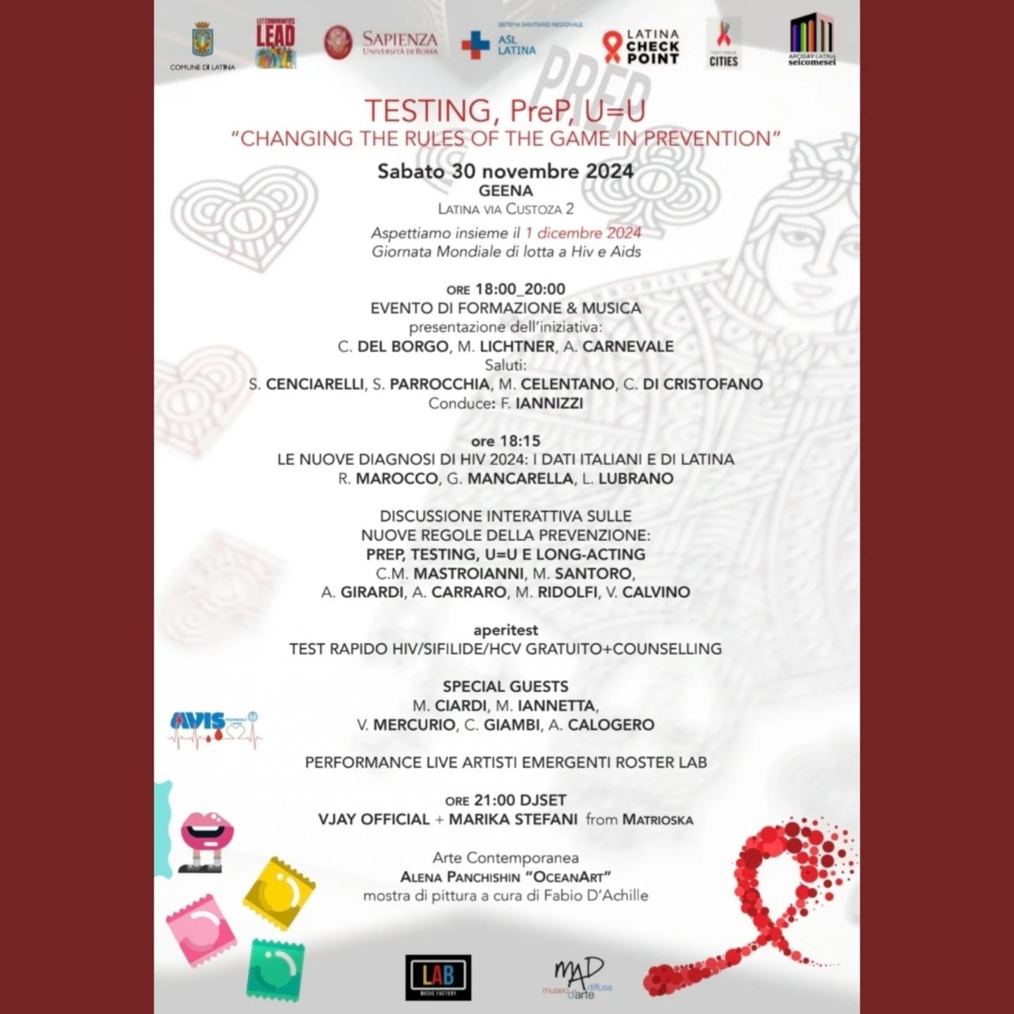Anche quest’anno Latina aderisce attivamente alle iniziative nazionali e internazionali di prevenzione legate alla Giornata Mondiale di lotta all’AIDS. Il Latina Checkpoint - nato dalla collaborazione tra la Asl di Latina, il Reparto di Malattie Infettive dell’Ospedale  Goretti, le associazioni (Sei come sei/Arcigay Latina), l’Università Sapienza e il Comune - ha organizzato un evento di prevenzione e musica per questo sabato 30 Novembre, alle 18.00, presso il locale Geena a Via Custoza a Latina.