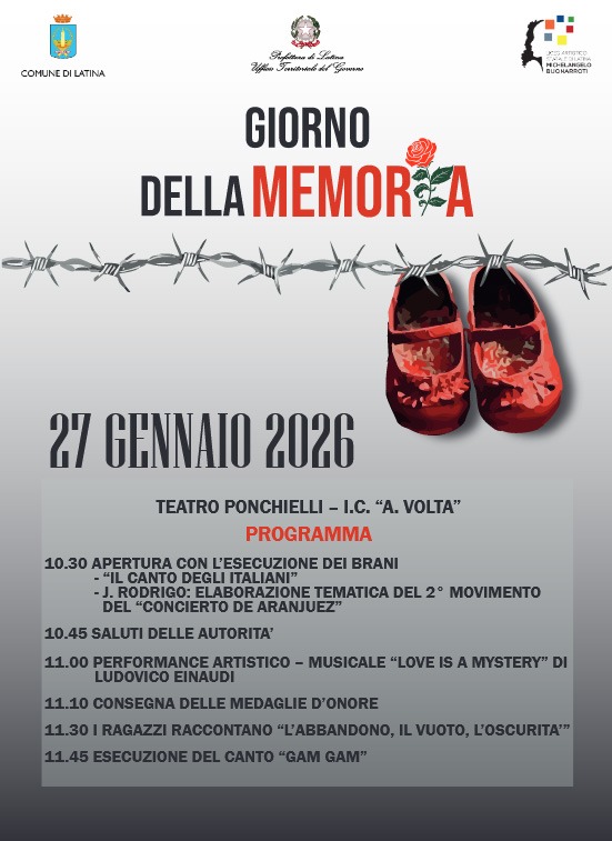 Domani martedì 27 gennaio, alle ore 10.30, si terrà, presso il Teatro Ponchielli di Latina, la manifestazione in occasione del Giorno della Memoria. Nel corso dell'evento organizzato dalla Prefettura in collaborazione con l'Istituto comprensivo "Alessandro Volta" di Latina, il Prefetto Ciaramella consegnerà le medaglie d'onore alla memoria ai familiari di cinque militari pontini, deportati e internati nei lager nazisti e destinati al lavoro coatto per l'economia di guerra. Gli studenti si avvicenderanno sul palco con racconti, momenti di riflessione e approfondimento sul tema della Shoah ed esecuzione di brani musicali. La locandina dell'evento è stata realizzata dagli allievi delle classi di grafica del Liceo artistico "Michelangelo Buonarroti" di Latina.