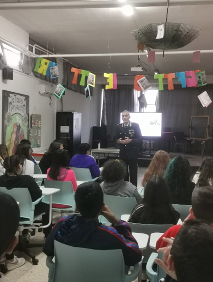 Nelle diverse fasi che hanno caratterizzato l’incontro, è stato proiettato un video istituzionale dell’Arma dei Carabinieri e illustrate ai presenti le nozioni essenziali che caratterizzano i comportamenti delle persone violente. La sentita ed attiva partecipazione degli studentie dei loro insegnanti, ha determinato un costruttivo confronto e una partecipe interazione dei ragazzi sui temi trattati, finalizzati ad approfondirne contorni e tratti salienti sia dal punto di visto sociale ed educativo, sia dal punto di vista più strettamente legato alle funzioni preventive e repressive dell’Arma dei Carabinieri contro ogni forma di violenza e illegalità.