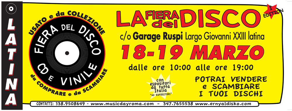 Per gli amanti del vinile, questo fine settimana a Latina si svolge la “Prima Fiera del Disco”. L’evento è ospitato negli spazi del garage Ruspi, in Largo Giovanni XXIII. Domani e domenica – al costo di 3 euro – la fiera si può visitare dalle 10.00 alle 19.00.