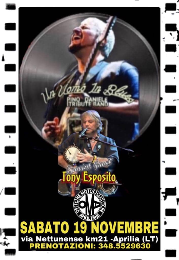 Il 19 Novembre sarà la volta di  Tony Esposito, che si esibirà sul palco delle “Officine Motociclistiche Apriliane”con la tribute band di Pino Daniele “Un uomo in Blues”.