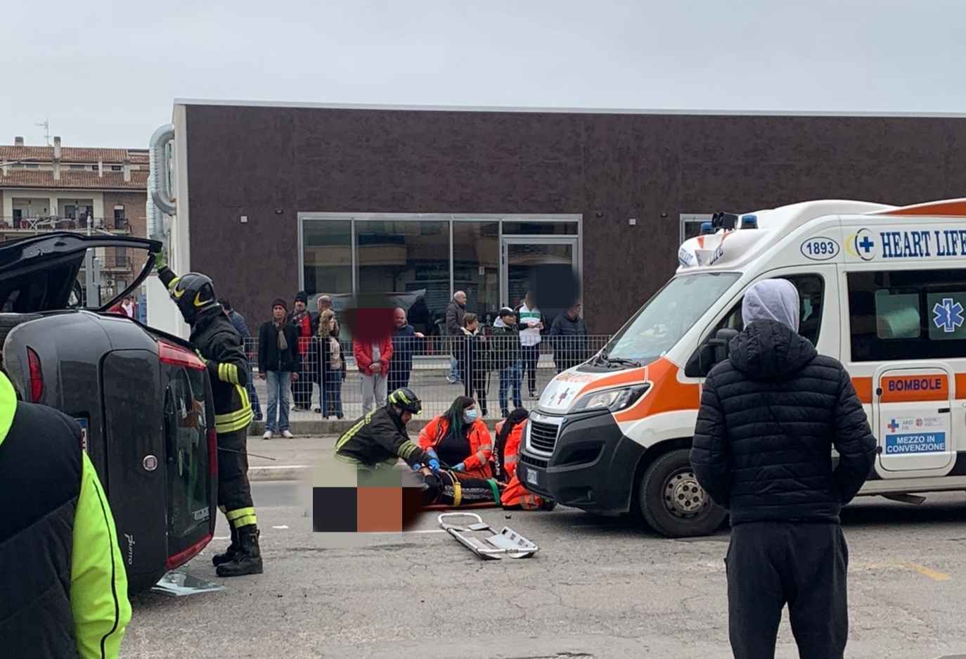 Grave incidente lungo via Ugo La Malfa, ad Aprilia: nello scontro tra due auto, una si ribalta in strada. Interviene l'eliambulanza.