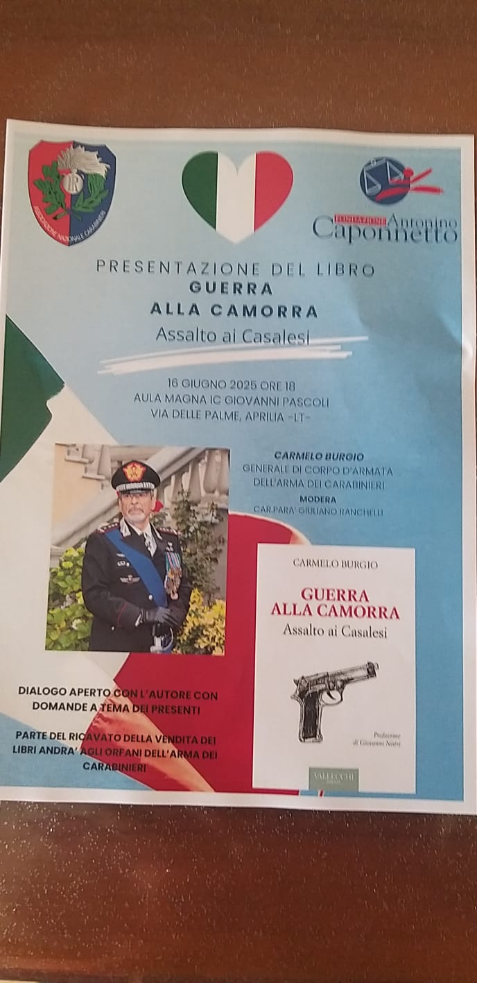 “Guerra alla camorra”, partecipato incontro ad Aprilia con il Generale Carmelo Burgio. Ieri pomeriggio, presso la scuola “Giovanni Pascoli”, si è tenuta la presentazione del libro del Generale Burgio, “Guerra alla camorra”, organizzata dall’associazione “Caponnetto” e dall'Associazione Nazionale Carabinieri di Aprilia.