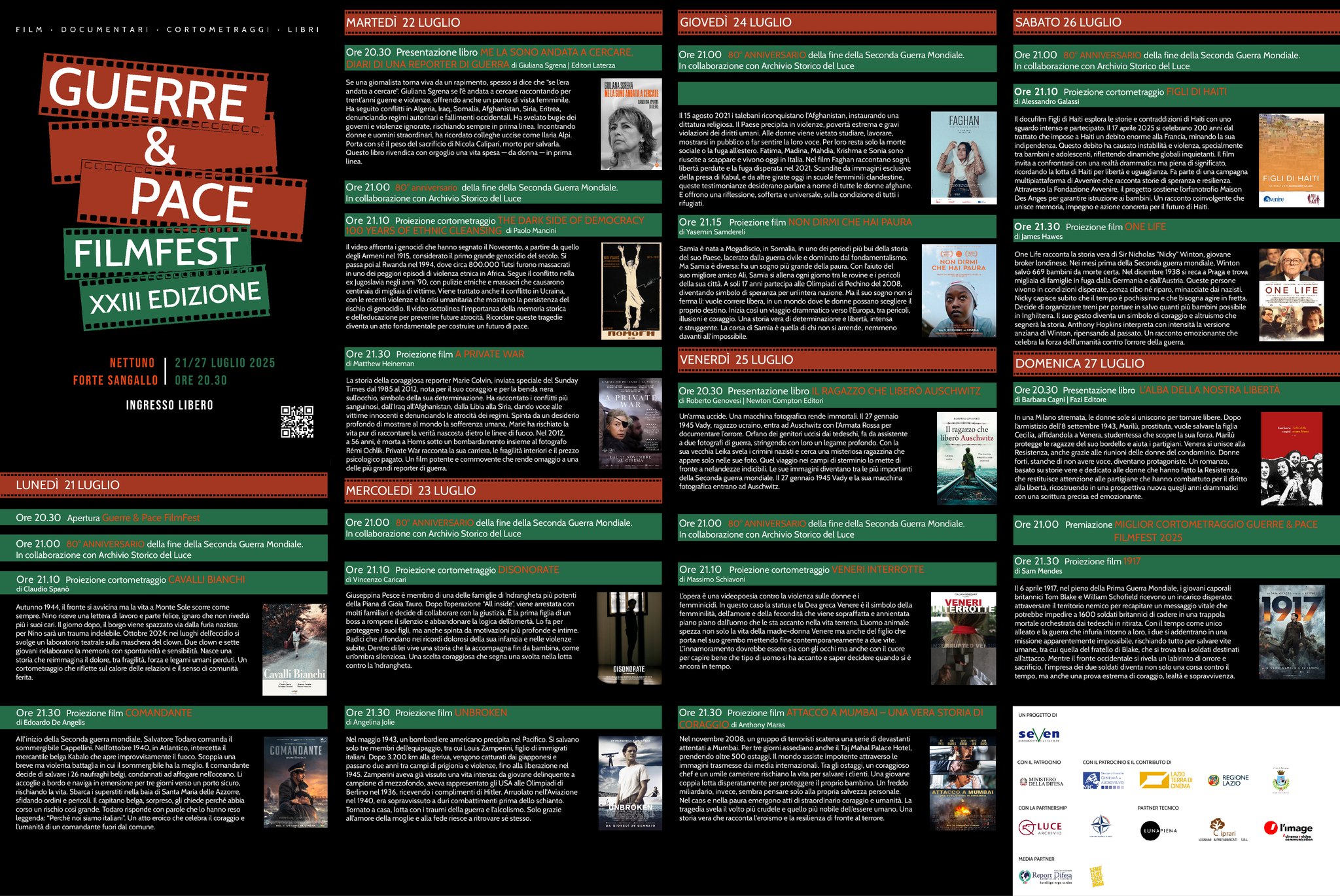 Si chiude questo fine settimana Nettuno il “Guerra & Pace Film Fest”, giunto quest’anno alla sua 23esima edizione. Sino a domenica 27 luglio in programma, tutte le sere, proiezione di film, cortometraggi, filmati d'archivio ed anche presentazioni di libri. L’appuntamento è al Forte Sangallo. L’ingresso è gratuito.