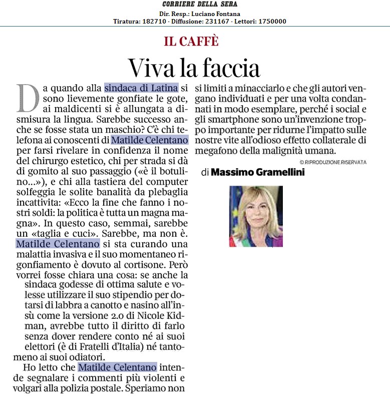 Body shaming, il sindaco di Latina dà mandato all’avvocato Archidiacono per presentare querela contro gli haters che l’hanno insultata sui social. “Ho dato mandato di presentare querela - spiega la Celentano - contro coloro che nell’ultimo periodo hanno pubblicato commenti denigratori nei miei confronti, giudicandomi non per la mia funzione di Sindaco, ma per il sospetto di ricorrere alla chirurgia estetica. Il senso di questa iniziativa, oltre che per tutelare me stessa e l’immagine che rappresento per la città, è rivolto alla difesa del diritto di ciascuna persona, soprattutto le donne e in particolare chiunque non abbia possibilità di avere voce, che è vittima di body shaming e di attacchi provenienti da quest’orribile fenomeno degli odiatori che si manifesta attraverso il peggiore utilizzo dello strumento dei social. Questa la considero una battaglia di civiltà, che voglio portare avanti a tutela di tutte le donne che non devono essere giudicate per il loro aspetto estetico”.