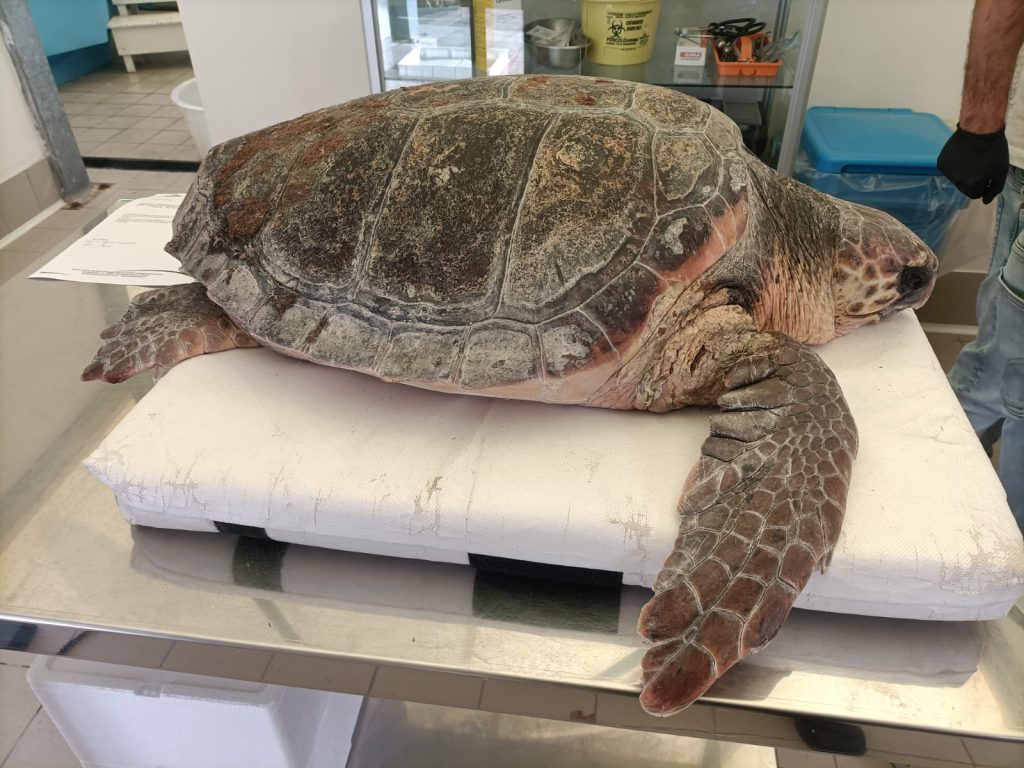 Il giorno 04.11.2023, alle ore 11.30 circa, il personale del Centro di Recupero per la Fauna Selvatica è intervenuto congiuntamente al Nucleo Carabinieri Forestali di Terracina, su segnalazione di un cittadino, sul lungomare di Sabaudia in località Sacramento per il recupero di un esemplare di tartaruga marina (Caretta caretta) adulto di circa 30 kg. Trattasi di specie a rischio di estinzione e pertanto sottoposta al massimo regime di protezione nell’ambito della Convenzione di Washington (CITES). In particolare, l’animale si trovava in evidente difficoltà poiché era rimasto a lungo impigliato con la zampa anteriore destra in un groviglio di reti e due taniche vuote in plastica che ne ostacolavano i movimenti ed il galleggiamento oltre ad impedirne la regolare alimentazione.