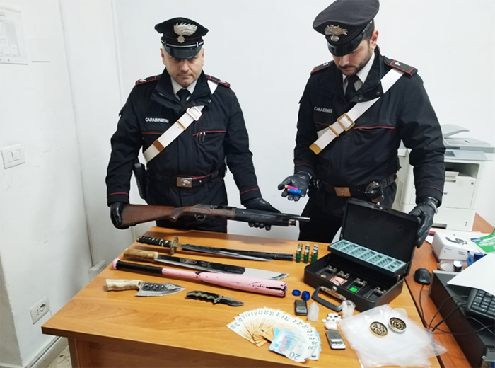 I Carabinieri intervengono per un caso di maltrattamenti, trovano droga, armi e denaro contanti.