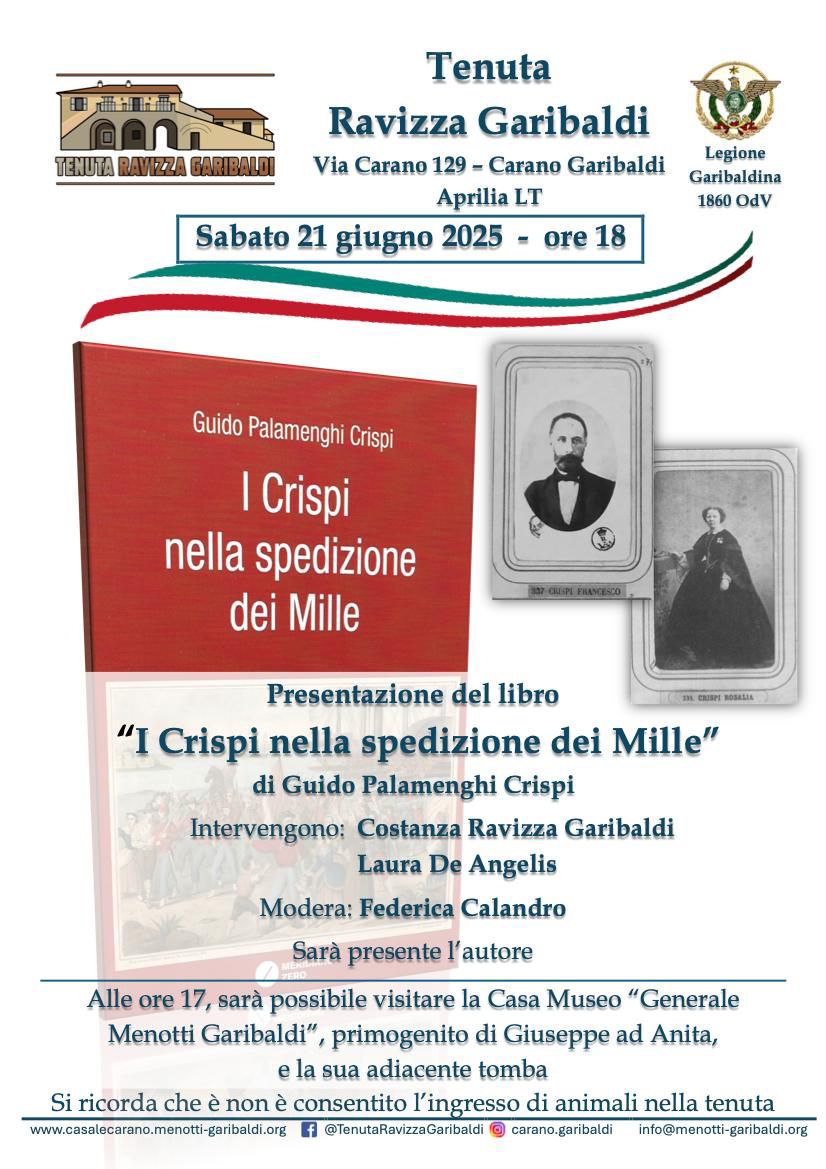 “I Crispi nella Spedizione dei Mille”: alla Tenuta Ravizza Garibaldi di Carano, ad Aprilia, questo sabato 21 giugno la presentazione del libro di Guido Palamenghi Crispi, pronipote di Francesco Crispi...