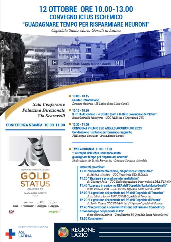 Nel corso dell’evento, sarà consegnato il premio “ESO-Angels Awards” al “Santa Maria Goretti” di Latina, come Centro Oro 2023, riconoscimento internazionale per i risultati ottenuti nell’ambito della Rete Stroke aziendale.