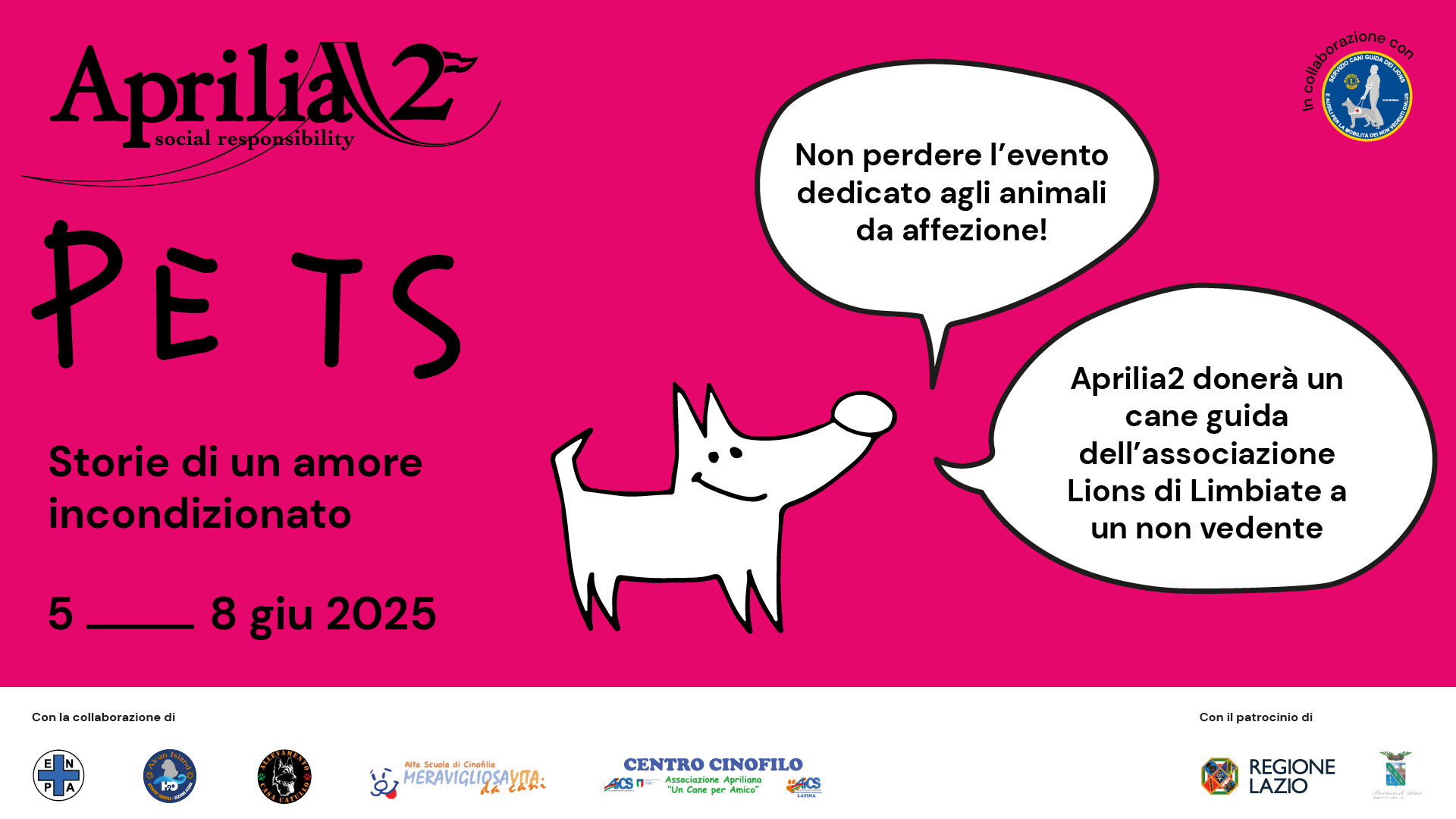 Da questa iniziativa nasce l’evento denominato PETS che vede il coinvolgimento dei Comuni, delle Autorità e degli Enti cittadini, nonché la partecipazione di molte associazioni quali ENPA, Akun Island, Alta Scuola di Cinofilia Meravigliosa Vita da Cani, Associazione Apriliana ‘‘Un Cane per Amico’’.