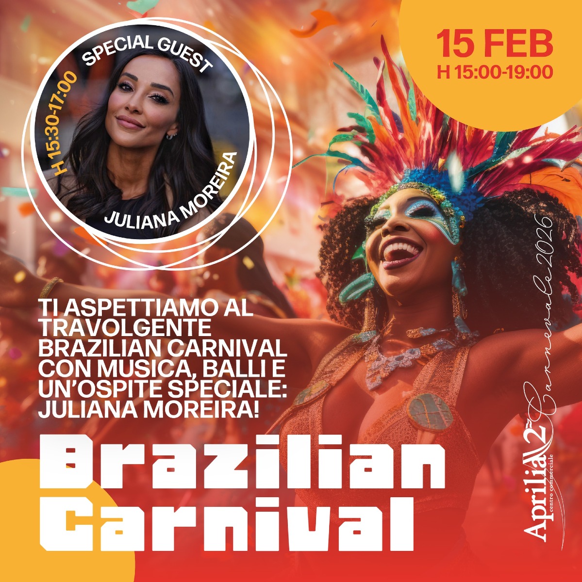 Domenica 15 febbraio, dalle 15:00 alle 19:00, ad Aprilia2 si celebrerà il Carnevale Brasiliano con un’ospite d’onore: dalle 15:30 alle 17:00 ci sarà, infatti, Juliana Moreira. Sarà un pomeriggio di coloratissimi show, performance acrobatiche, coreografie uniche e tanto altro!