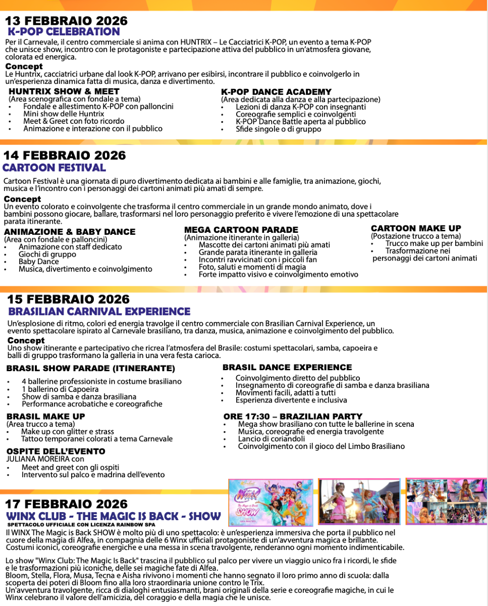 Passeggiando per il centro commerciale, inoltre, si potranno incontrare le Cacciatrici K-Pop e ballare insieme a loro in uno show pieno di energia. Ci si potrà immergere nel simpaticissimo Cartoon Festival con i personaggi dei cartoni animati più amati e godersi, appunto, il Carnevale Brasiliano.