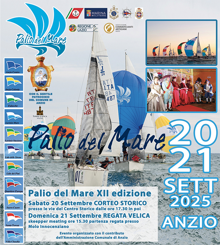 Il centro di Anzio si tinge di storia, colori e sport con il “Palio del Mare”, giunto alla sua 12esima edizione. L’appuntamento è per oggi a partire dalle 17.30 e domani, domenica 22 settembre. Si parte questo pomeriggio con la tradizionale rievocazione storica nelle vie del centro. Domani, poi, sarà la volta della regata velica, con partenza delle imbarcazioni alle 15:30 dal Molo Innocenziano.