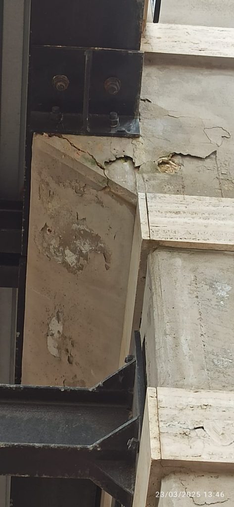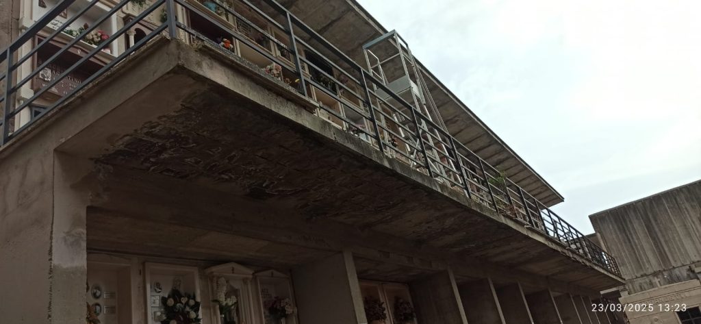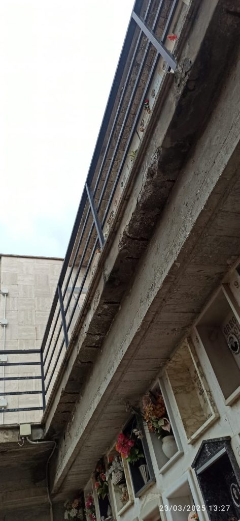 “Le concrezioni minerali, le stalattiti, frutto dell'abbandono in cui la struttura comunale versa non sono le uniche criticità che ho riscontrato. - spiega Ragusa - Ecco l'elenco delle criticità riscontrate: infiltrazioni d'acqua, muri crepati, ballatoi privi di intonaco e con parti della soglia venuta via e con il ferro del cemento armato arrugginito e a vista, erba cresciuta sui muri e sui pavimenti, muri con intonaco staccato, escrementi di piccioni, api che rendono inavvicinabili alcuni loculi e mettono a rischio di shock anafilattico gli utenti, luci non funzionanti in interi settori e un cancello inserito nella ringhiera di un ballatoio che dà sul vuoto, non bloccato con lucchetti come altri all'interno della struttura,, lampioni abbattuti, scatole di derivazione con fili elettrici visibili all’interno, indicazioni dei settori stampate su carta che le intemperie hanno reso illeggibili o con scritte a matita minuscole, ringhiere arrugginite e pericolose, bagni inutilizzabili perché chiusi a chiave, tettoie a protezione di alcuni loculi realizzate in maniera improvvisata incollandoci sopra dei pezzi di plexiglas, ascensore sporco.