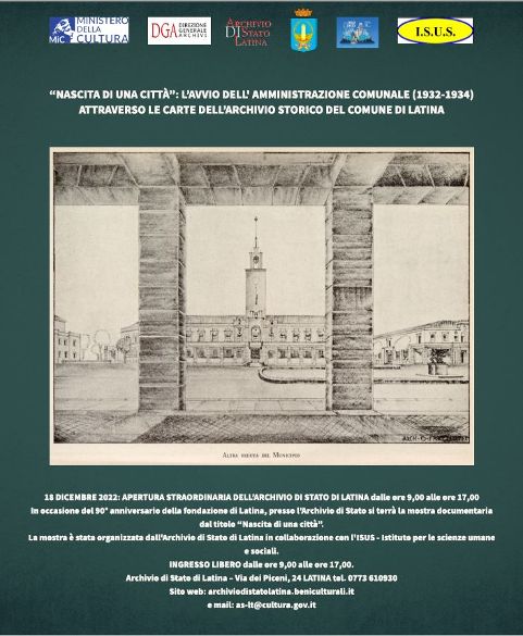 Al programma si associano due eventi: la Mostra documentaria “Nascita di una città” l’avvio dell’amministrazione comunale (1931-1934) attraverso le carte dell’Archivio di Stato di Latina. L’esposizione, realizzata in collaborazione e con il contributo scientifico dell’ISUS-Istituto di Scienze Umane e Sociali, sarà visitabile per tutta la giornata del 18 dicembre dalle 9 alle 17 presso i locali dell’Archivio di Stato di Latina in via dei Piceni 24.