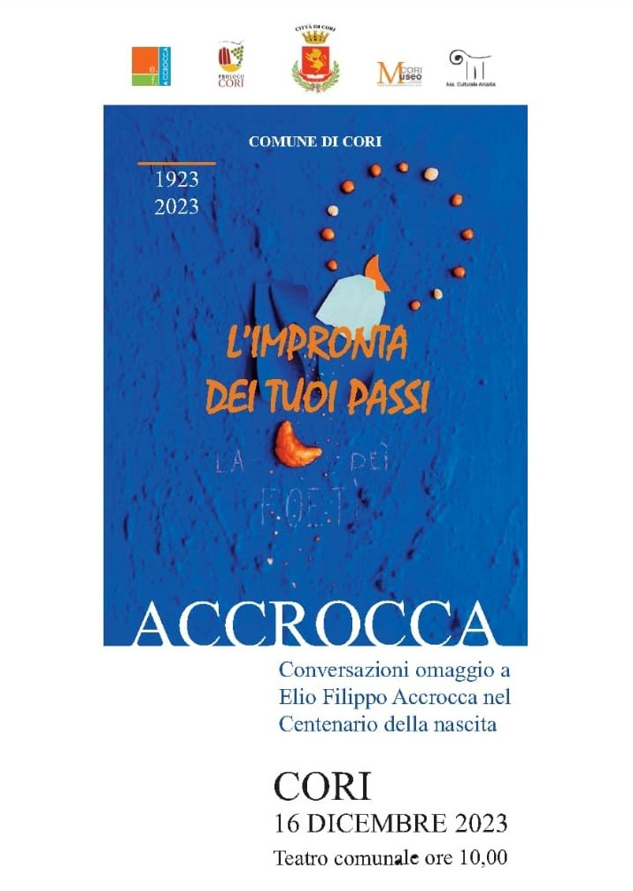 Si chiudono sabato 16 dicembre le celebrazioni dell’anno Centenario di Elio Filippo Accrocca, nato a Cori il 17 aprile 1923. L’Amministrazione cittadina dedica un ultimo omaggio al poeta che ha conservato per tutta la vita un rapporto d’amore con il luogo d’origine. Un sentimento ricambiato: Accrocca è ancora oggi, a quasi trent’anni dalla scomparsa, presenza viva nella cittadina lepina, impegnata a ricordarne la produzione poetica, il profilo umano e l’impegno culturale. “Quest’incontro ci darà l’occasione di ricordare il poeta e l’uomo. Elio Filippo Accrocca – scrive il Sindaco di Cori Mauro Primio De Lillis - ha avuto un ruolo di rilievo nella poesia italiana del Novecento ed è una figura che dovremmo conoscere meglio e approfondire, in primis noi coresi”. Non a caso l’ultimo incontro del Centenario è stato intitolato L’impronta dei tuoi passi, citazione di un verso di Accrocca che rimanda al valore del ricordo e della memoria.