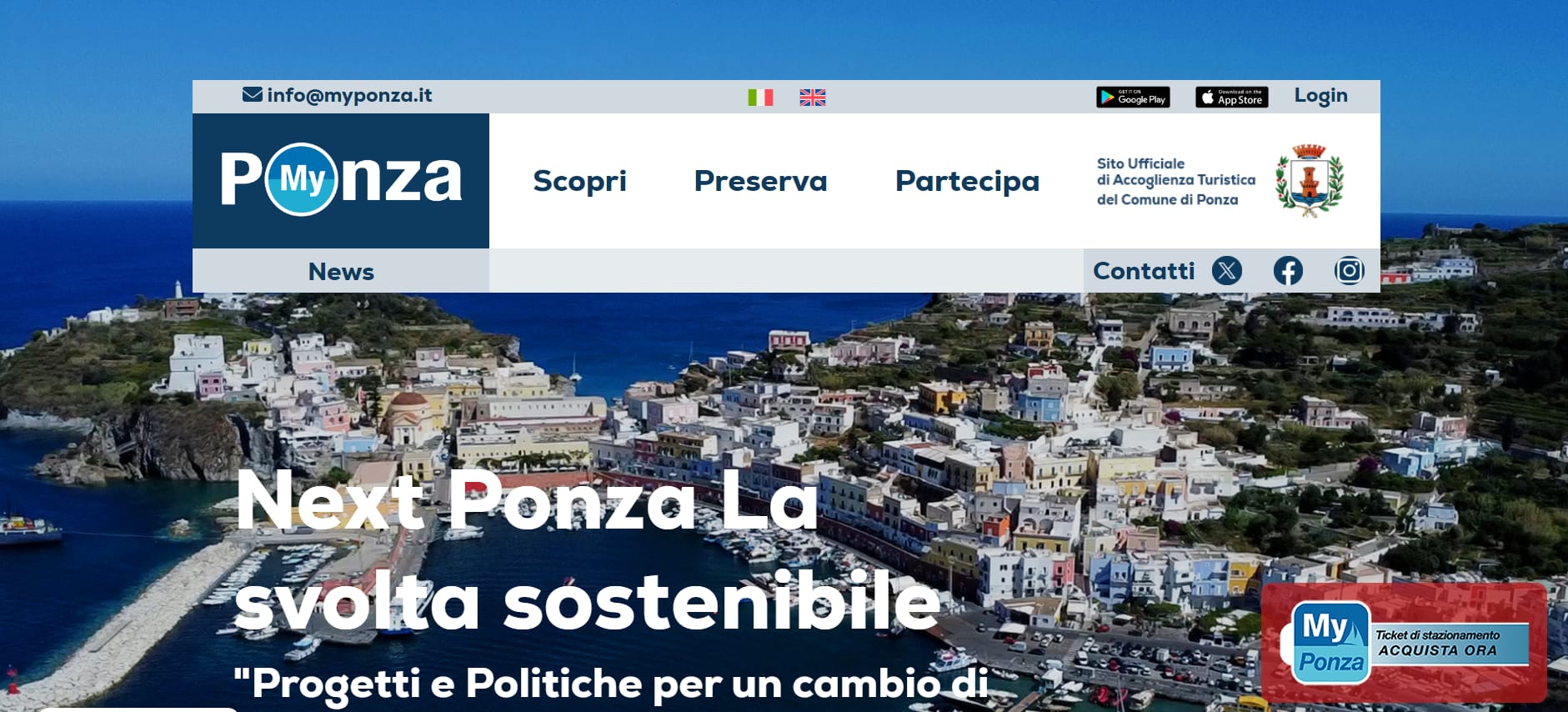 Da oggi, 27 luglio è online il sito www.myponza.it, da cui si potranno attingere tutte le informazioni inerenti il Ticket di Stanziamento ed il Barca@Barca. Da lunedì 29 luglio sarà attivo sul portale anche il sistema di pagamento per il Ticket di Stazionamento che diventerà obbligatorio dal 1° agosto. Oltre che dal portale, il Ticket si potrà pagare comodamente dall'App MyPonza, disponibile sia su PlayStore (android) che su AppStore (ios).