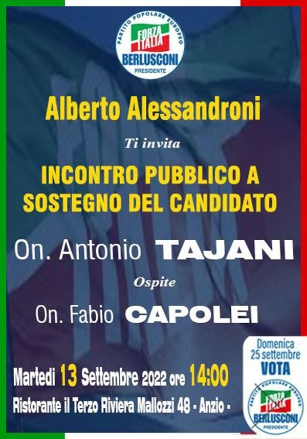 Il coordinatore nazionale di Forza Italia, Antonio Tajani, oggi ad Anzio. A partire dalle 14.00, sarà sulla Riviera Mallozzi, assieme al consigliere regionale del Lazio Fabio Capolei per confrontarsi con i cittadini del territorio, in vista delle elezioni politiche del 25 settembre prossimo. Tajani è candidato alla Camera dei deputati nel collegio uninominale di Velletri, che raggruppa ben 18 comuni dell’area metropolitana di Roma.