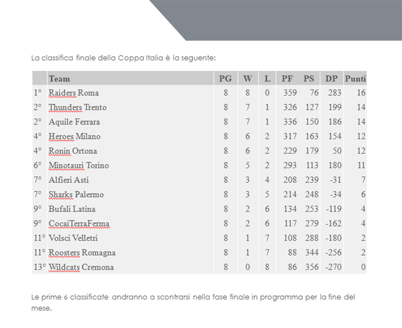 La formazione senior dei Latina Buffalos non riesce ad accedere per un soffio alle Finals di Coppa Italia FIDAF. Il bottino finale della competizione è quindi di 2 Vittorie e 6 Sconfitte, confermando il risultato dello scorso anno, ma mostrando grandi miglioramenti in termini di preparazione, numeri e partecipazione del roster.