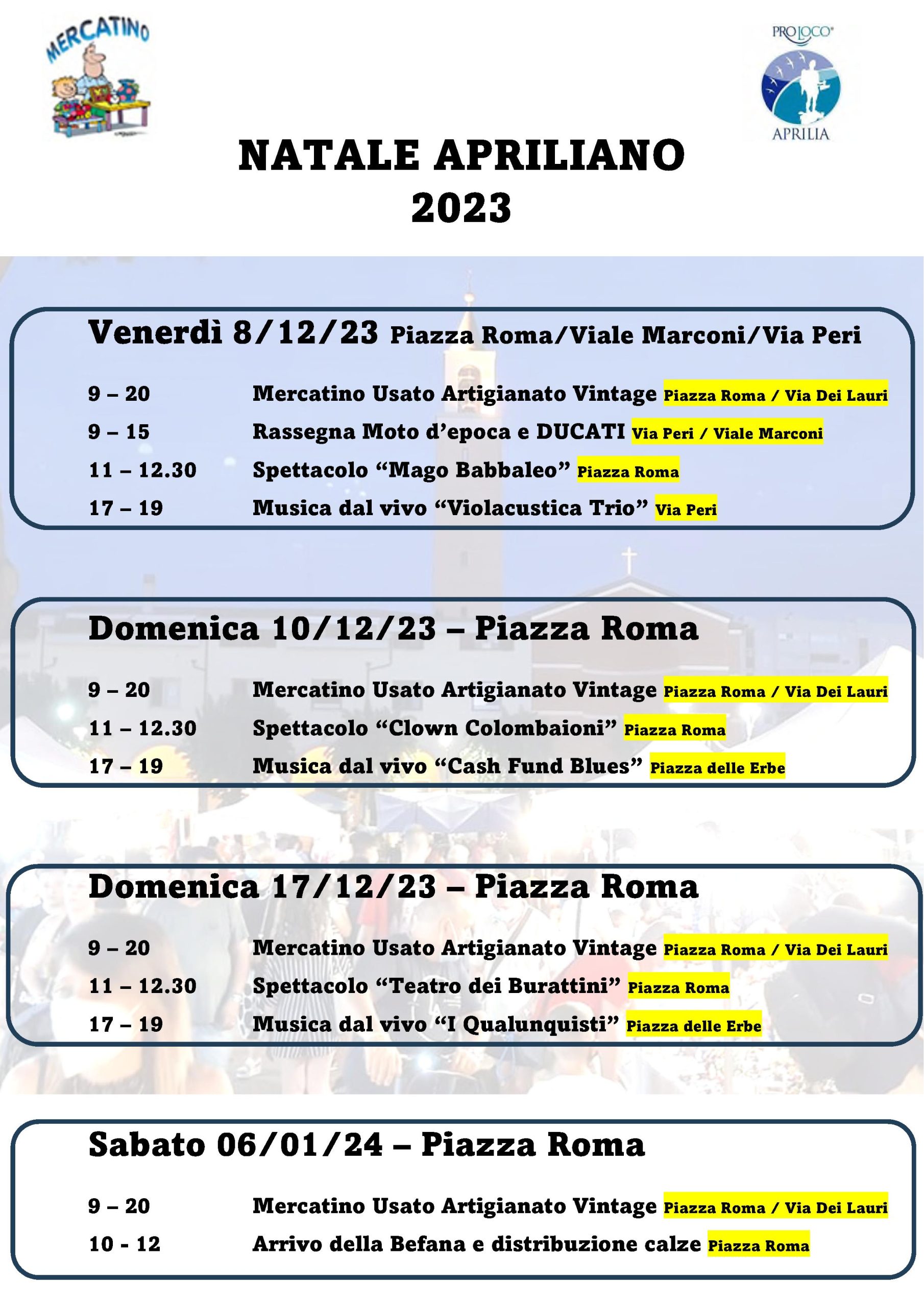 “Sia nel centro storico, sia nei quartieri, - spiega l’associazione Il Mercatino di Aprilia - realizzeremo un vero e proprio viaggio nel tempo con i tanti oggetti presenti negli stand dei nostri espositori, regaleremo sorrisi e risate ai bambini con i nostri clown e maghi. Un programma ricchissimo che riempirà di eventi la città di Aprilia, che si chiuderà il 6 gennaio per la gioia dei bambini presenti in Piazza Roma con la nostra simpaticissima Befana che regalerà ai bambini presenti in Piazza Roma tante calze ripiene di dolci. Ringraziamo l'Amministrazione comunale e la Proloco di Aprilia che hanno creduto nel nostro progetto. Ringraziamo i Comitati che ci supporteranno per i mercatini svolti nei quartieri, che hanno creduto a questa proposta, certi di ripetere questo progetto anche nei prossimi anni, coinvolgendo un numero sempre maggiore di quartieri”.