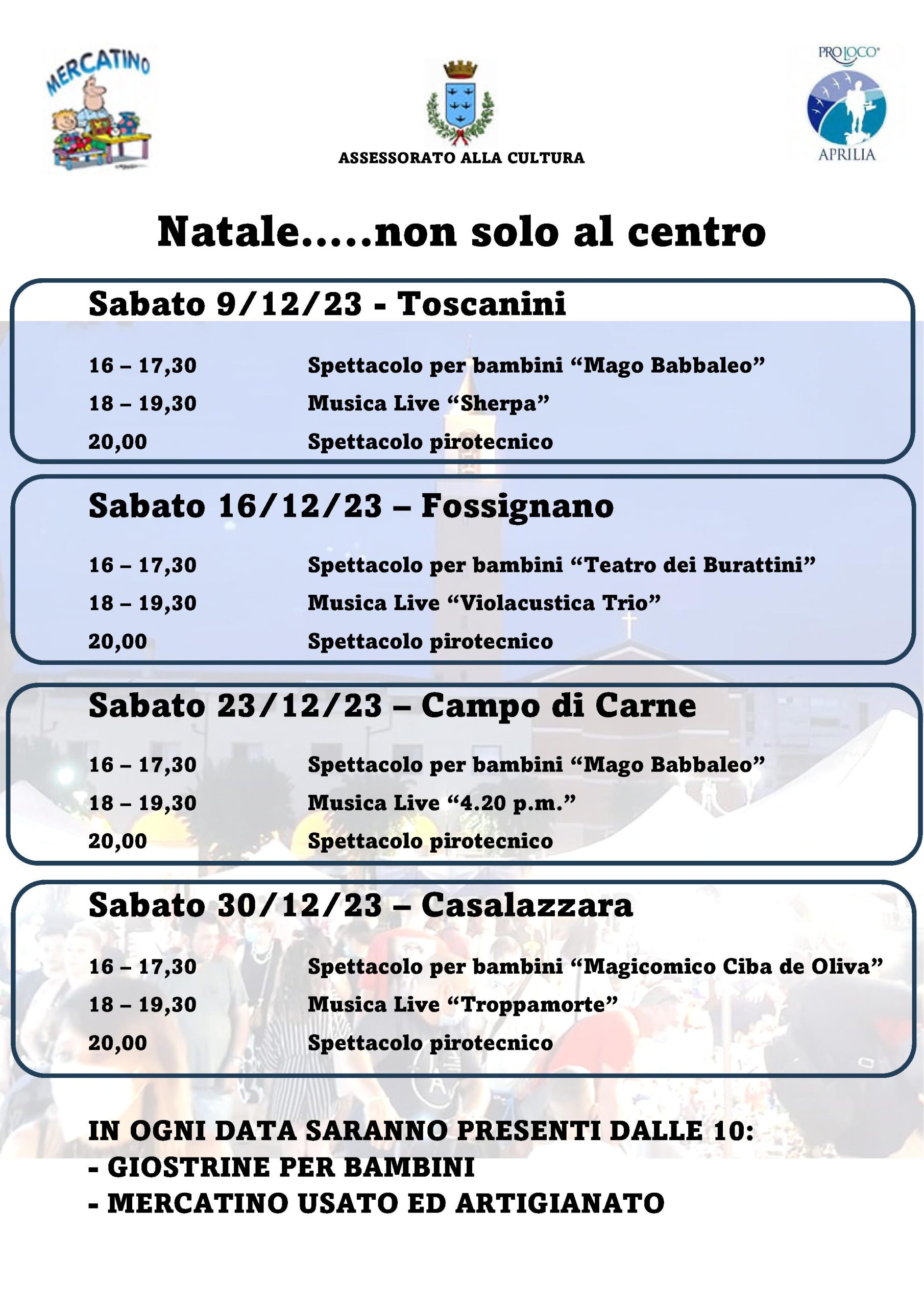 “Sia nel centro storico, sia nei quartieri, - spiega l’associazione Il Mercatino di Aprilia - realizzeremo un vero e proprio viaggio nel tempo con i tanti oggetti presenti negli stand dei nostri espositori, regaleremo sorrisi e risate ai bambini con i nostri clown e maghi. Un programma ricchissimo che riempirà di eventi la città di Aprilia, che si chiuderà il 6 gennaio per la gioia dei bambini presenti in Piazza Roma con la nostra simpaticissima Befana che regalerà ai bambini presenti in Piazza Roma tante calze ripiene di dolci. Ringraziamo l'Amministrazione comunale e la Proloco di Aprilia che hanno creduto nel nostro progetto. Ringraziamo i Comitati che ci supporteranno per i mercatini svolti nei quartieri, che hanno creduto a questa proposta, certi di ripetere questo progetto anche nei prossimi anni, coinvolgendo un numero sempre maggiore di quartieri”.