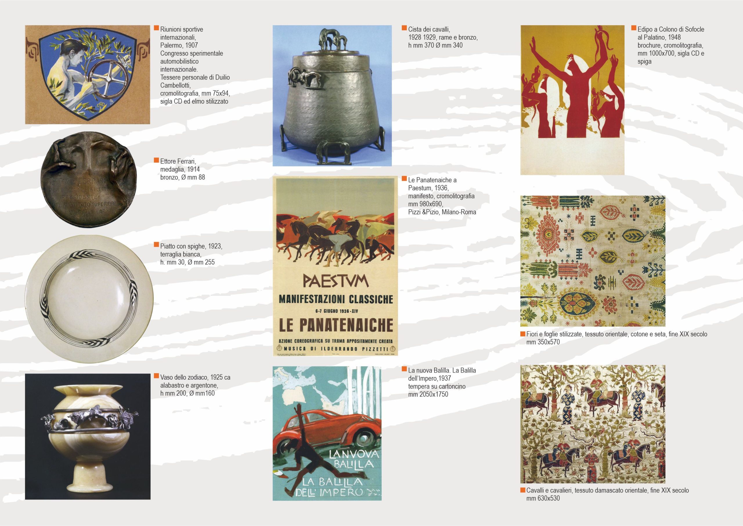 La rassegna dedicata a Cambellotti vede la presenza di una selezione del materiale tessile, per la maggior parte inedito, collezionato dall’Artista a partire dal Suo viaggio a Costantinopoli nel 1898 e, cronologicamente, opere che coprono l’intera Sua attività a partire dalla grafica pubblicitaria di fine ottocento, progetti grafici e pubblicitari per il teatro e per le mostre d’arte, ex libris, incisioni legate al Suo pacifismo, arti decorative,rivisitazioni di cultura materiale sottolineate dalla Sua inconfondibile firma.