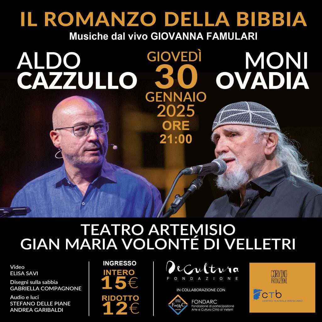 Stasera alle 21.00 un evento fuori abbonamento al Teatro Artemisio-Volonté di Velletri. Sul palco Aldo Cazzullo e Moni Ovadia, due grandi personaggi del panorama intellettuale italiano e internazionale. In scena lo spettacolo “Il romanzo della bibbia”.