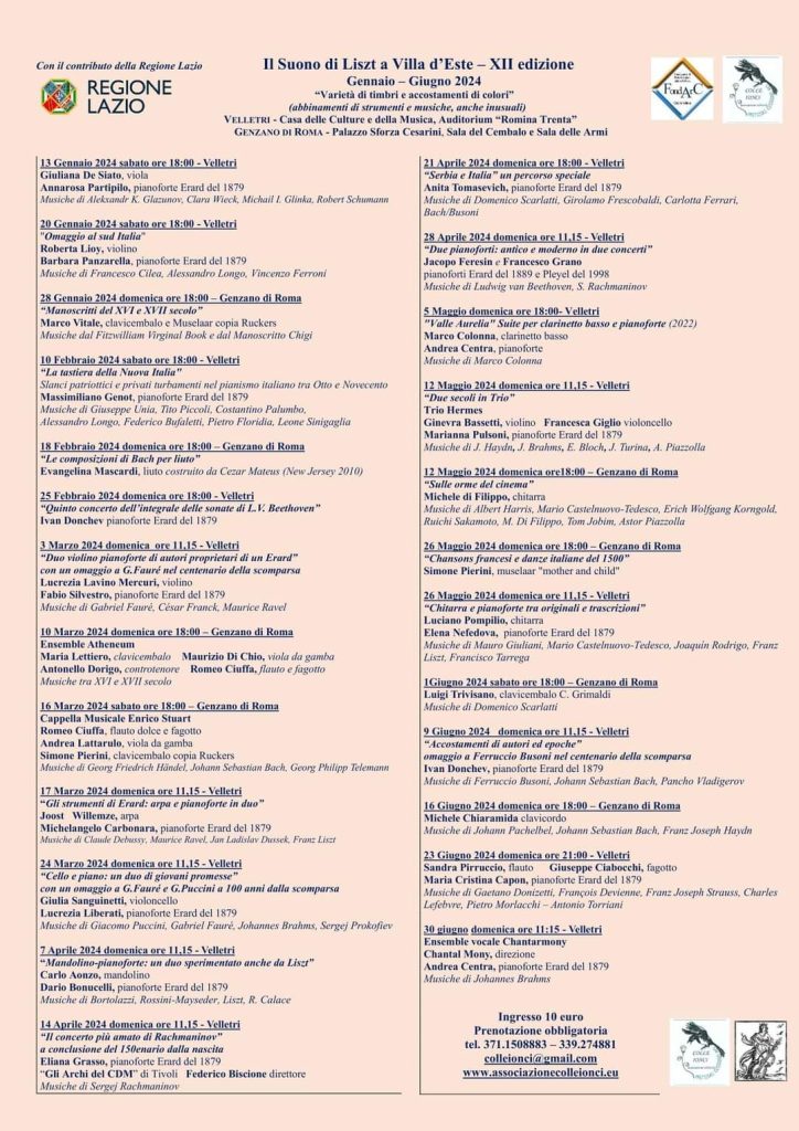 La programmazione, messa a punto dall’Associazione Colle Ionci con il patrocinio della Fondazione di Partecipazione Arte & Cultura Città di Velletri e con il contributo della Regione Lazio, prevede spettacoli da gennaio a giugno 2024. Il titolo del calendario è “Varietà di timbri e accostamenti di colori”, poiché gli artisti lavorano su abbinamenti di strumenti e musiche anche inusuali, per regalare al pubblico emozioni uniche.